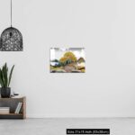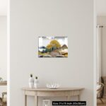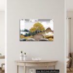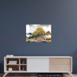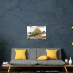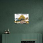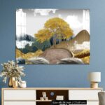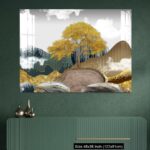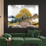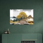 Acrylic Wall Decor – Gray background with golden trees, deer, mountains, and white clouds. golden, black, turquoise stone in water.
