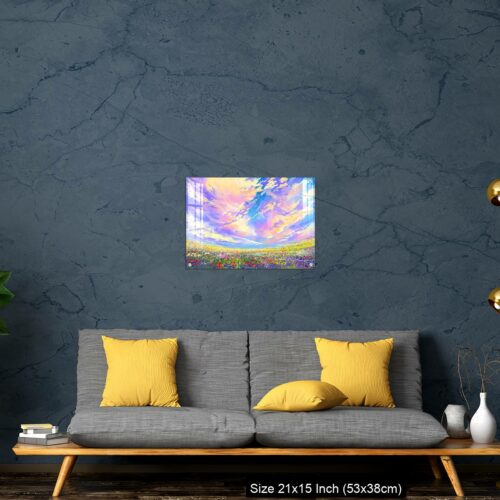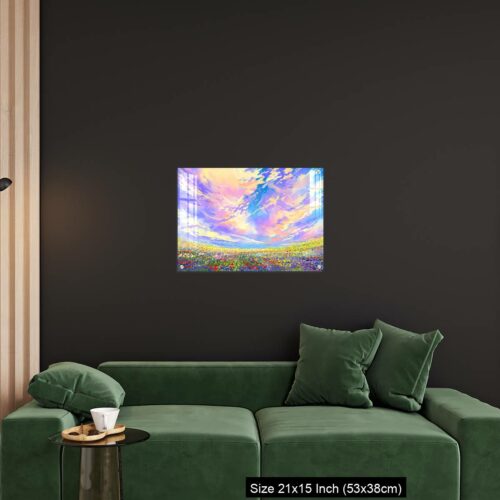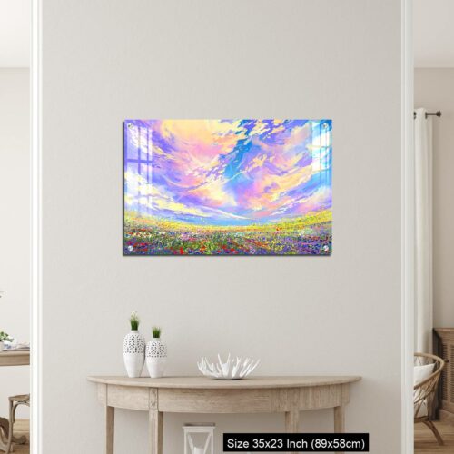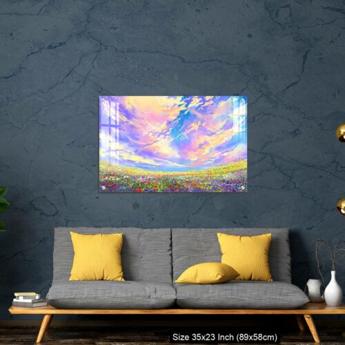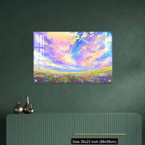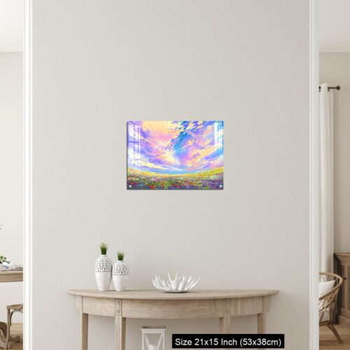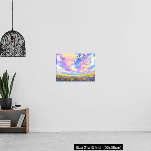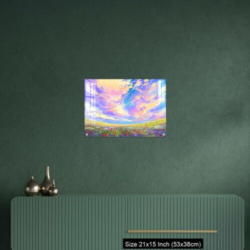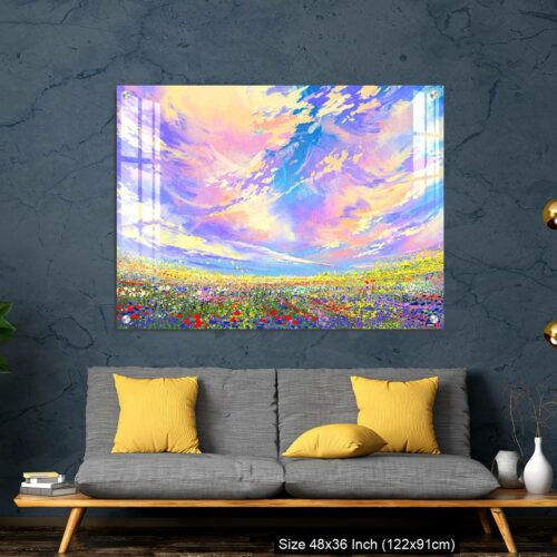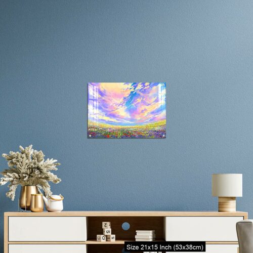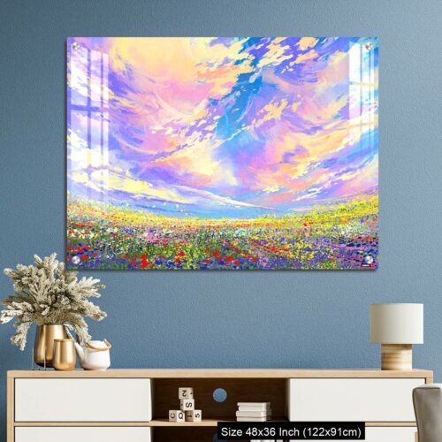OMGs® Acrylic Wall Decor – colorful flowers in field under beautiful clouds