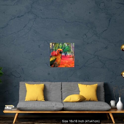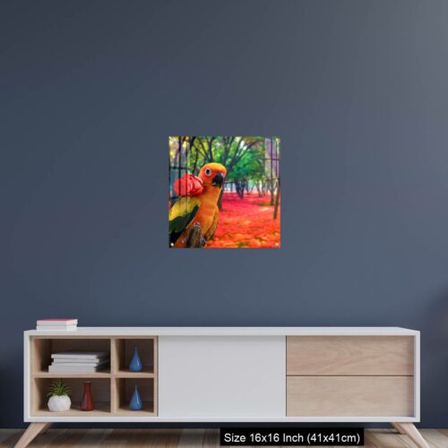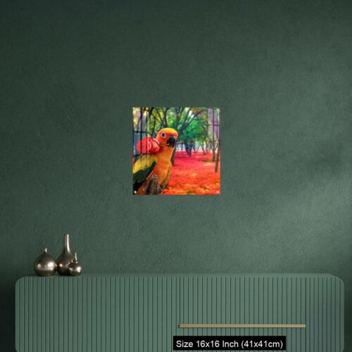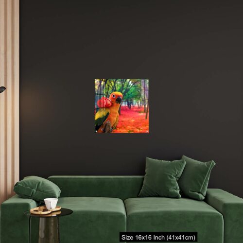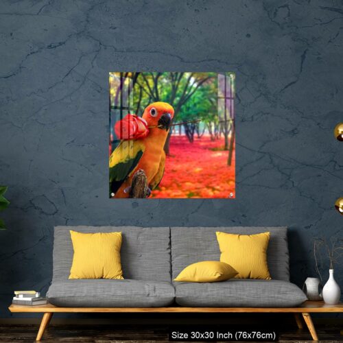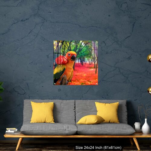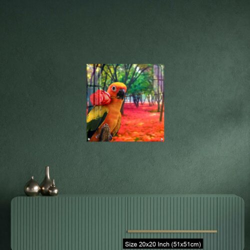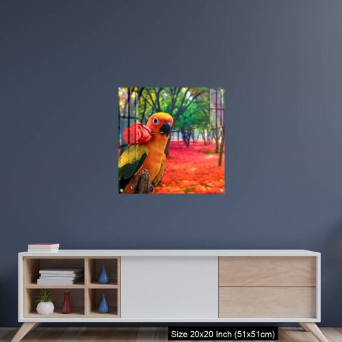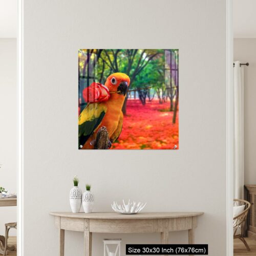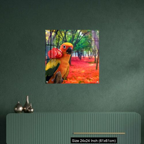 Acrylic Wall Decor – Cute Parrot Holding a Red Rose in a Colorful Forest