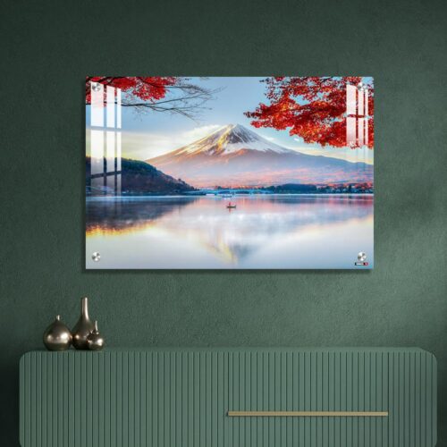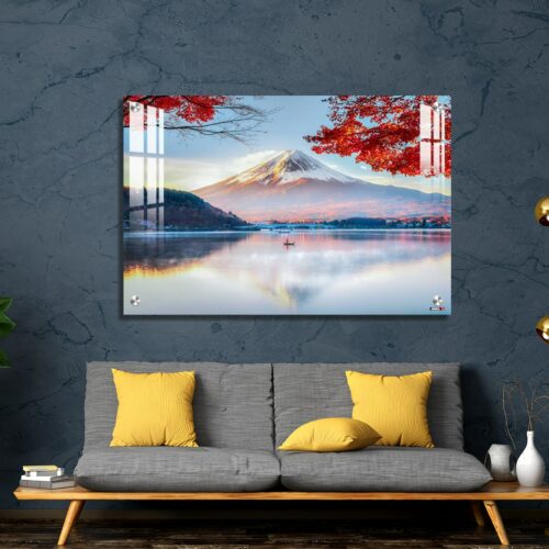 Acrylic Wall Decor – Fuji Mountain , Red Maple Tree and Fisherman Boat with Morning Mist in Autumn, Kawaguchiko Lake, Japan