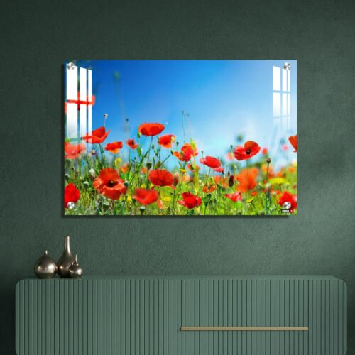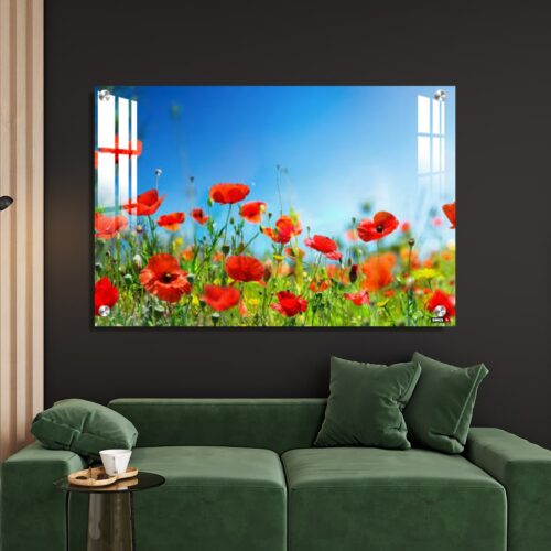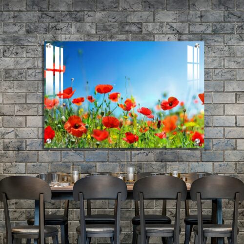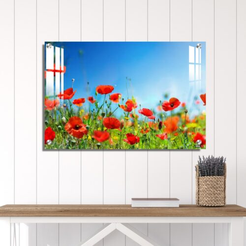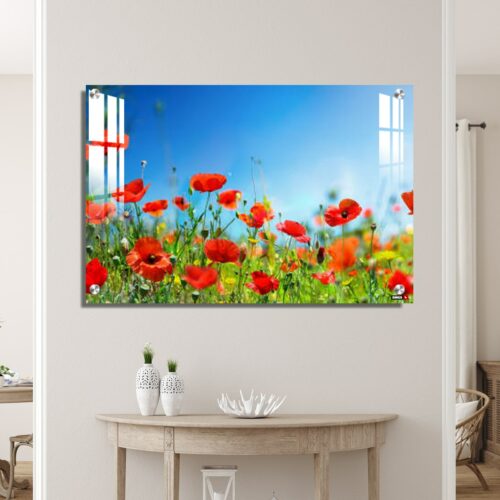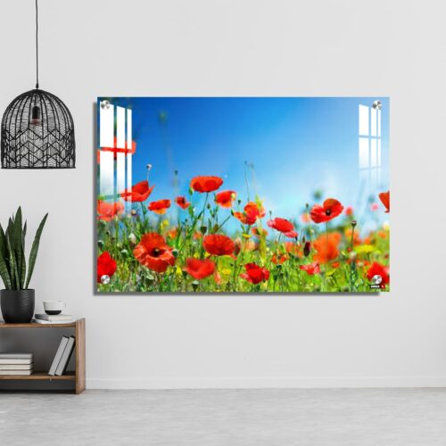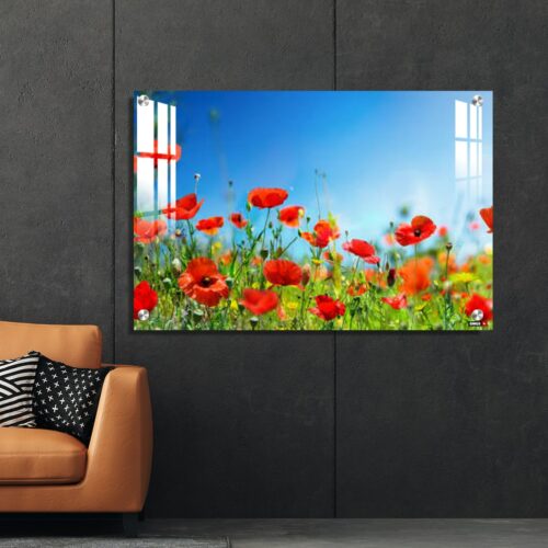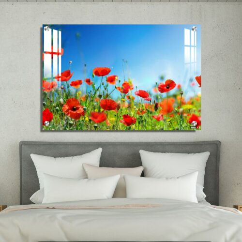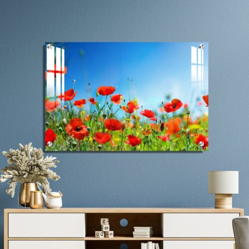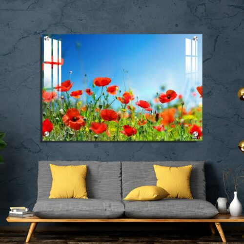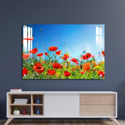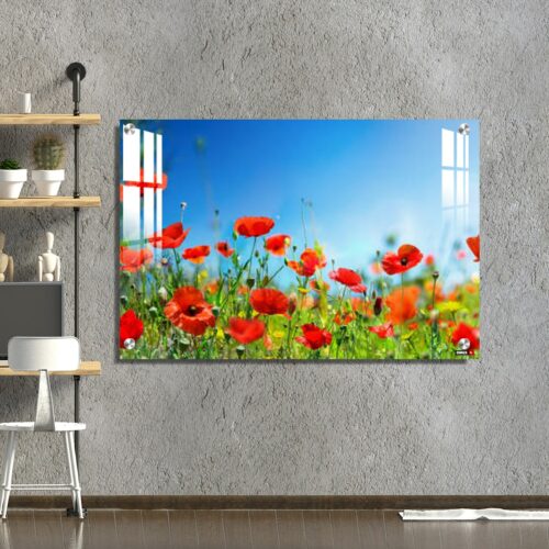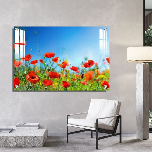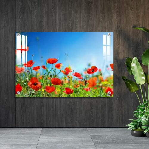 Acrylic Wall Decor – Poppies In Field In Sunny Scene With Blue Sky